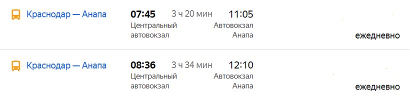 | 23:00 | 08:30 | 9 ч 30 м | неизвестно | Поиск на дату | Ж/д вокзал, Краснодар – ост. Автовокзал | Маршрут Маршрут Увидели ошибку? | |||