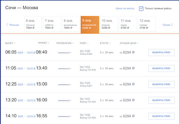 Стоимость прямых рейсов на самолёт из Новосибирска в Сочи по авиакомпаниям