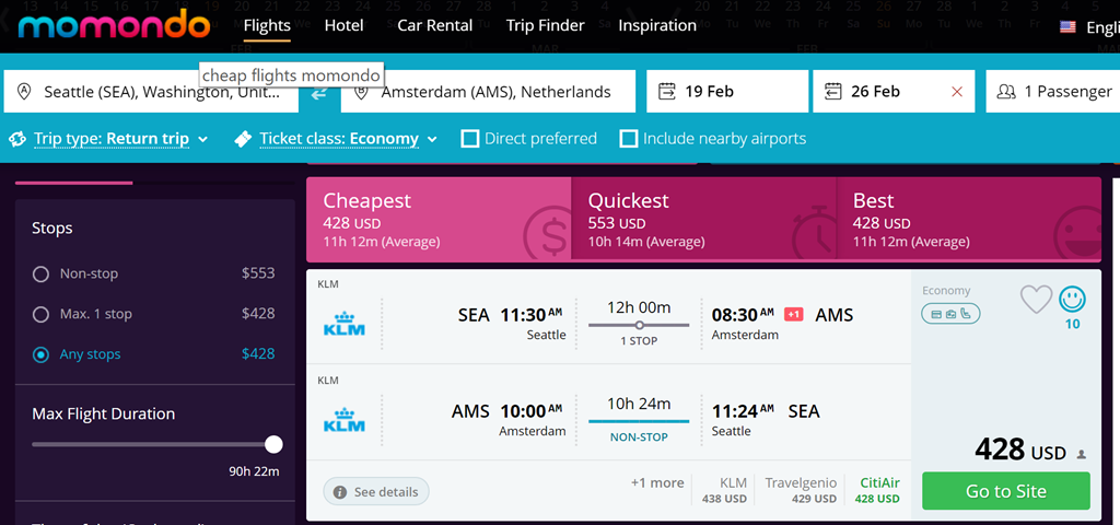 momondo позволяет пользователям показывать только те рейсы в Париж, которые предлагают гибкую политику бронирования, а также другие полезные фильтры и функции.