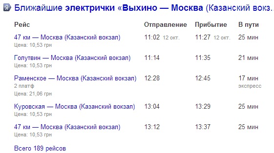 кроме пятниц и выходных | Время отправления Казанский вокзал | Время прибытия Отдых | 0 ч. 56 мин. | ||