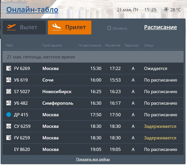 Ссылки на страницы официальных сайтов, содержащие постоянно обновляемое актуальное онлайн-табло прилетов и вылетов рейсов аэропорта.
