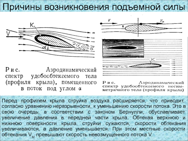 Струйки воздуха обтекают крыло несимметрично, больше отклоняясь сверху, чем снизу. Сверху струйкам приходится огибать выпуклую часть крыла, поэтому они сжаты и, следовательно, по закону неразрывности скорость течения воздуха здесь больше, чем вдали от крыла. Под крылом же, наоборот, скорость течения воздуха меньше, так как здесь происходит некоторое торможение воздушного потока (благодаря углу атаки).