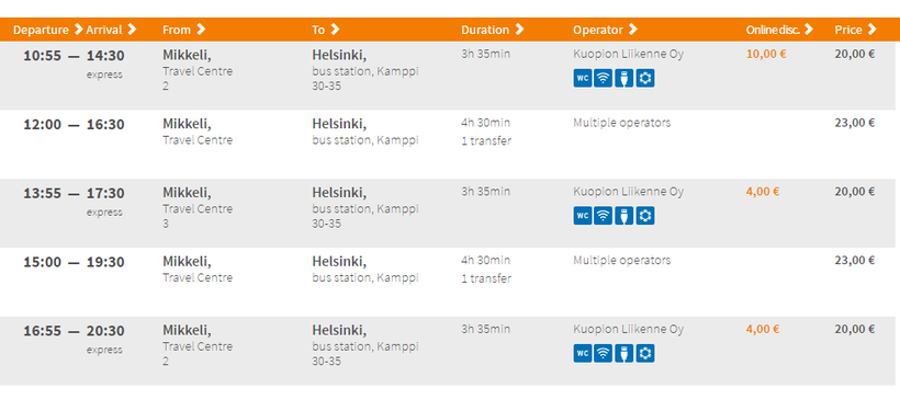 Если вы хотите посетить другие финские города, автобус также будет хорошим выбором, поскольку национальная автобусная служба (Matkahuolto) соединяет Хельсинки почти со всеми городами Финляндии. Все крупные города (Куопио, Лахти, Турку, Тампере, Оулу или даже Рованиеми) имеют прямое сообщение из аэропорта. В небольшие города можно добраться на автобусах из центра. Ищете конкретное направление? Ознакомьтесь с расписанием, доступным на официальном сайте Matkahuolto.