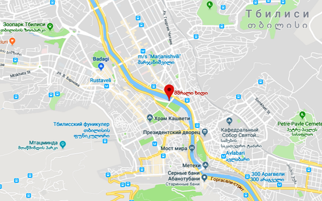 Маршрут движения – от аэропорта к центральному ж/д вокзалу через проспекты Руставели и Бараташвили. Удобное место выхода – остановка возле метро Авлабари, там же памятник-скульптура героям фильма Мимино. Рядом находится спуск Метехи и популярный район размещения недорогих отелей, хостелов и гест-хаусов. До стеклянного моста Мира – 10 минут ходьбы.