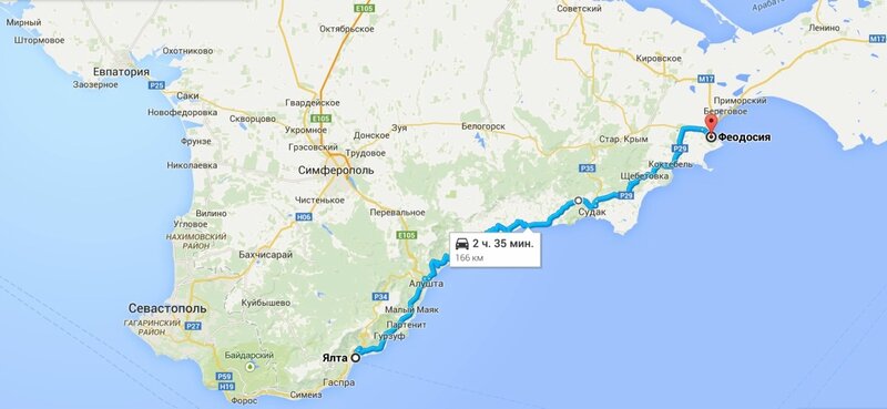 На машине доехать до Судака из столицы Крыма получится быстрее, так как в данном случае не будет дополнительных остановок. Расстояние – где-то 110 км, что по времени выйдет полтора часа. На карте маршрут выглядит так: