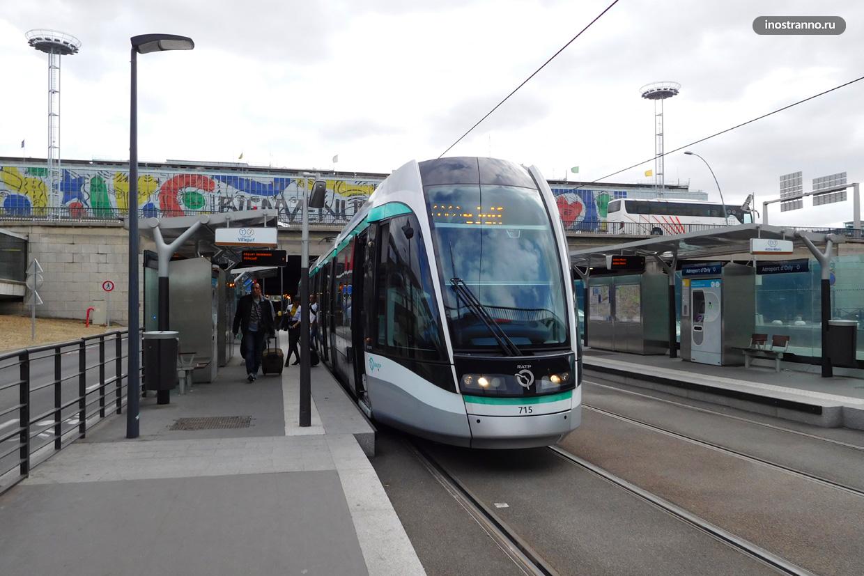 - В Орли трамвай останавливается у парковки терминала Южный (S), остановку легко найти по указателям «Tram T7».