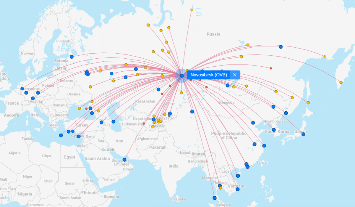 Аэропорт Толмачево (OVB) расположен в Новосибирске, подробные данные указаны в таблице ниже.