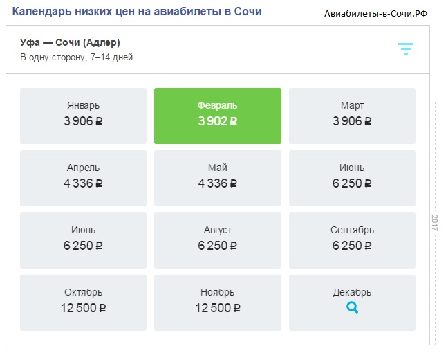 Также в поисковом сервисе встроена довольно полезная функция — календарь. По Вашему запросу на странице с результатом поиска выводится гиперссылка, после перехода по которой открывается таблица цен билетов на каждый из дней месяца. С помощью календаря, можно посмотреть, во сколько обойдется авиабилет на конкретную дату. Если время заранее не оговорено, можете откорректировать дату полета, подобрав наименьшую стоимость.