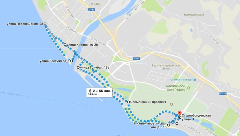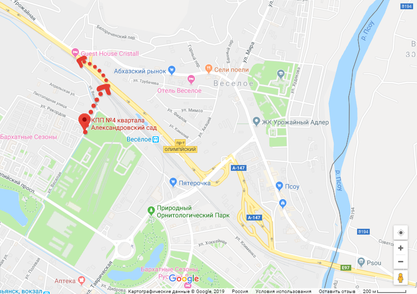 - из Адлера: на автобусах № 60, 105, 117, 124, 125, 134, остановка «Известия», пройти назад до пешеходного моста, перейти дорогу.