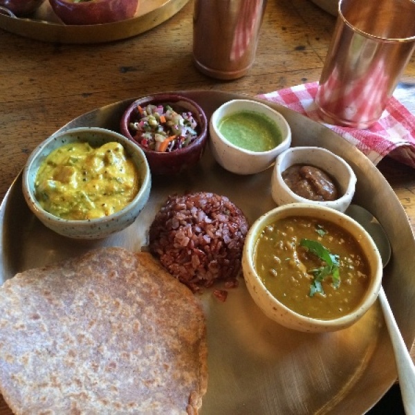 ЗАВТРАК. Завтрак бывает сладкий и соленый. Для сладкого готовят кашу из полбы: мелят на мельнице крупу, просеивают через сито и варят с кокосом, яблоком, листьями карри и орехами. К полбе подают лепешку досу из красного риса и чечевицы с топленым творогом, корицей и карамелизированным миндалем.