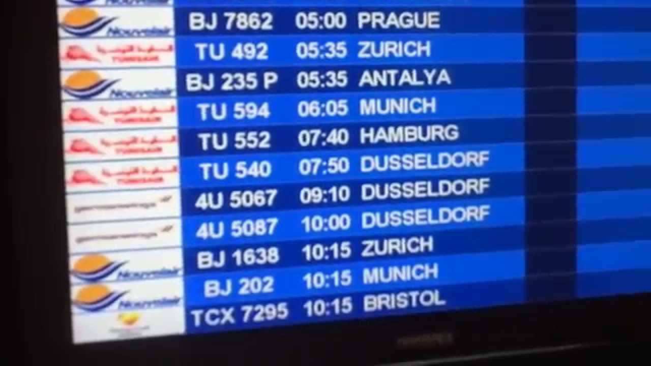 На онлайн-табло прилетов и вылетов самолетов аэропорта Хабиб Бургиба представлены электронные данные в режиме реального времени.