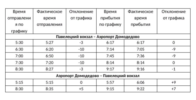 По сравнению с аэроэкспрессами, отправляющимися до Домодедово с Павелецкого вокзала, где населенность поезда иногда приближается к отметке в 100%, показатели работы на направлении Каланчевская-Домодедово, возможно, выглядят не столь впечатляюще. Но следует отметить положительную динамику, даже несмотря на то, что этот проект пока считается экспериментальным (здесь в день курсирует три пары поездов) и пользуется этой веткой в основном транзитный пассажир, приезжающий на московские вокзалы из других регионов страны. По результатам опросов, проведенных в аэроэкспрессах, он не всегда знает о том, что можно быстро добраться в аэропорт, не пользуясь метро или наземными видами транспорта.