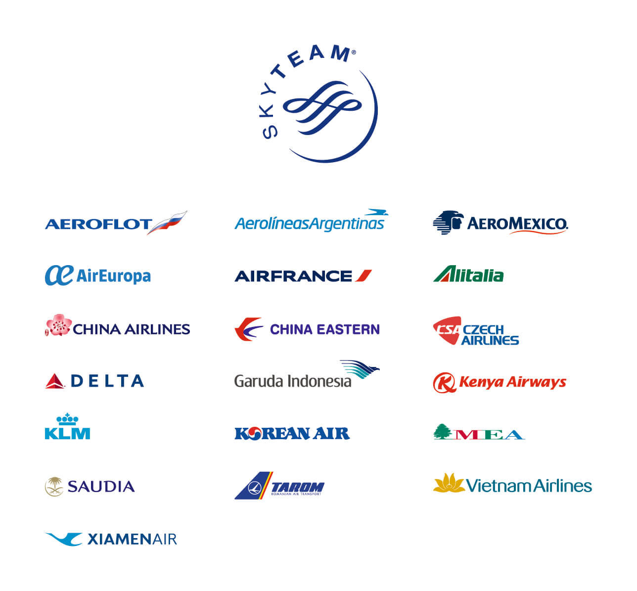 SkyTeam, основанный в июне 2000 года, состоит из 19 членов, которые в совокупности перевозят более 630 миллионов пассажиров каждый год по более чем 1150 направлениям. Альянс SkyTeam и его участники имеют 750 залов ожидания по всему миру. Пассажиры могут получить доступ к привилегиям в зависимости от статуса программы для часто летающих пассажиров авиакомпании-члена. SkyTeam имеет два уровня программы для часто летающих пассажиров: Elite и Elite Plus, которые связаны со статусом программ членства авиакомпаний. Класс путешествия