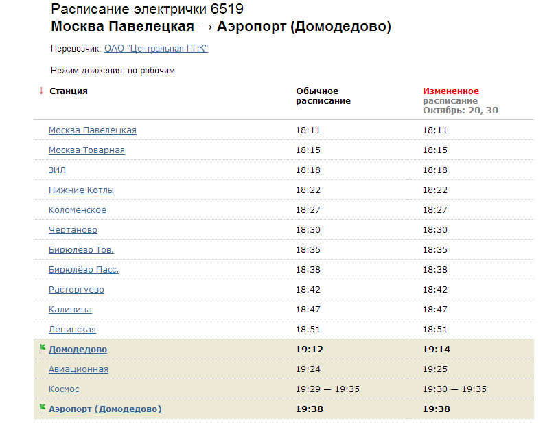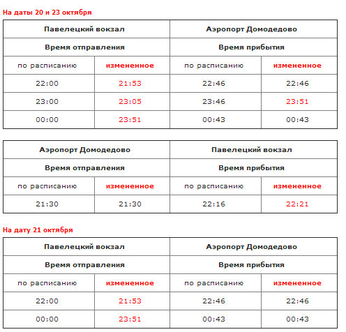 Отправление с Павелецкого вокзала | Прибытие в Домодедово | Отправление из Домодедово | Прибытие на Павелецкий вокзал |