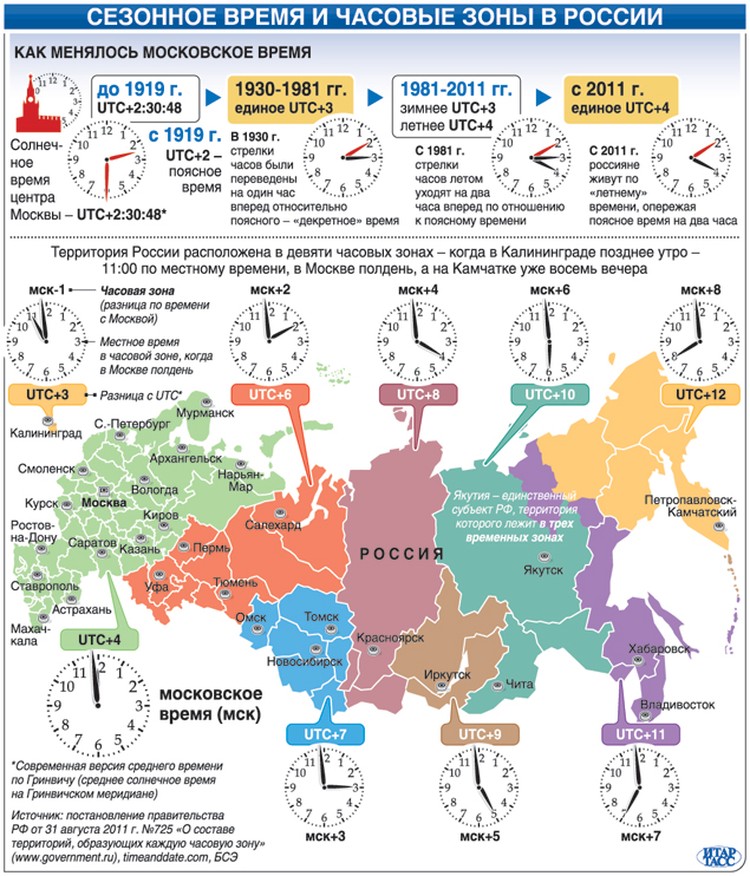 Количество часовых поясов постоянно меняется. Сейчас города страны и другие населенные пункты расположены в 11 часовых поясах.