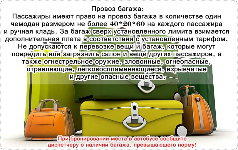- Клиент получает норму бесплатного провоза багажа, он может провозить несколько единиц багажа (1 сумка / ящик). Размеры багажа (длина-ширина-высота) до 203 см, ручной клади не более 55 * 40 * 20 см.
