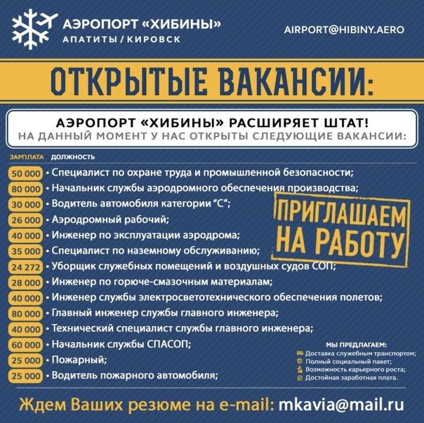 Почтовый адрес аэропорта Апатиты Хибины: 184209, Россия, Мурманская обл.