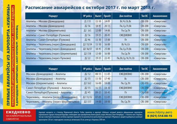 Расписание аэропорта Хибины: состоит из 6 рейсов. Самолеты вылетают по маршрутам: Кировск-Москва и прилетают рейсы Москва-Кировск, Санкт-Петербург-Кировск. Первый самолет вылетает в 11:35 по направлению Кировск-Москва. Последний рейс в 20:00 по маршруту Кировск-Санкт-Петербург. В расписании города преобладают рейсы авиакомпаний Северсталь, Псковавиа.