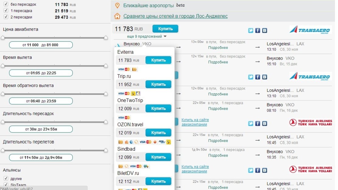 - Заполните форму поиска — укажите города вылета и прилета, даты туда-обратно, запустите поиск.