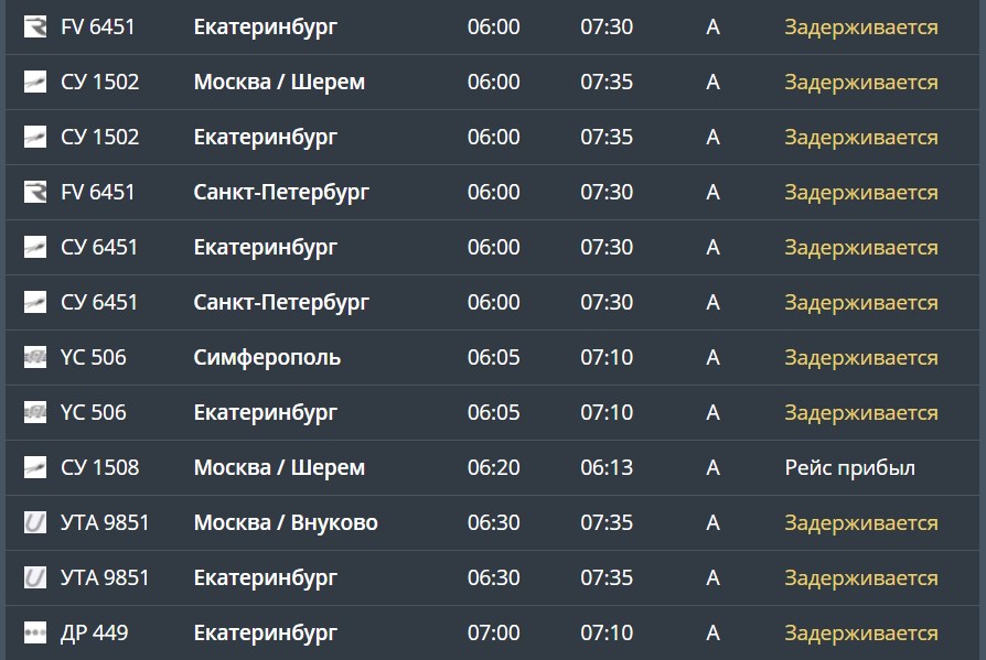 | 06:55 | DP592 | Санкт-Петербург (Аэропорт Пулково) | Pobeda | 738 | Задержан до 06:00 |