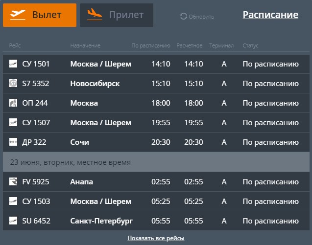 Здесь следует заметить: табло, которое вы наблюдаете перед собой, содержит данные, которые показывают в настоящий момент в аэропорту. Как было замечено, информация обновляется автоматически, потому все актуально на текущий момент.