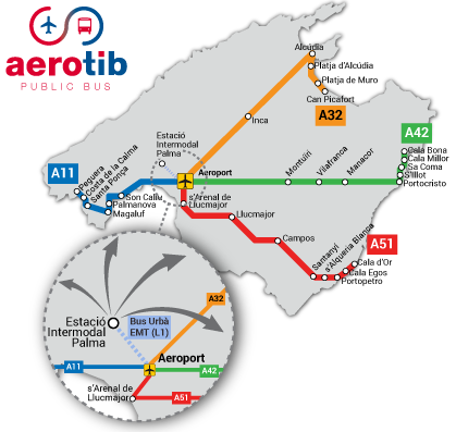 Автобус до аэропорта Пальма-де-Майорка: пассажиров обслуживают две автобусные линии. Автобусная остановка находится в передней части многоэтажной автостоянки на выходе D. Следующая остановка находится снаружи, напротив подъездной дороги.