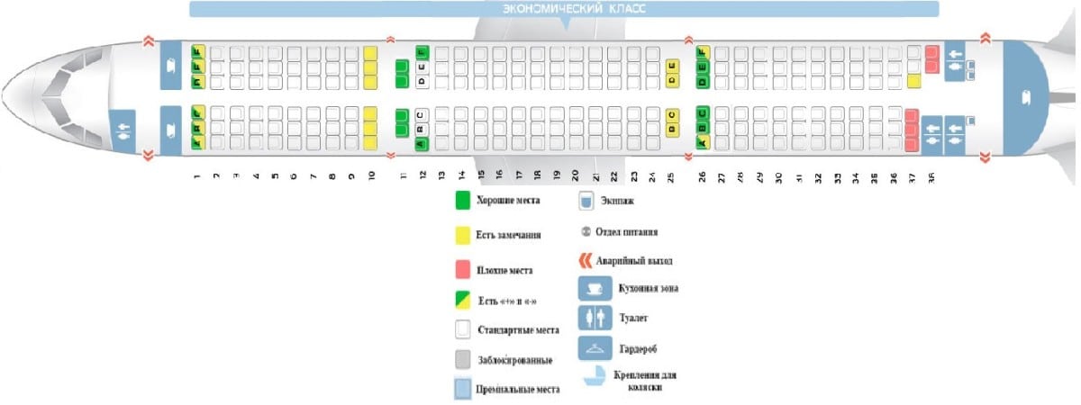 В экономклассе неудобны места перед аварийными выходами. Они могут быть расположены на 7, 8, 9 или 10 ряде. Главный недостаток этих кресел в невозможности откинуть спинку для отдыха.