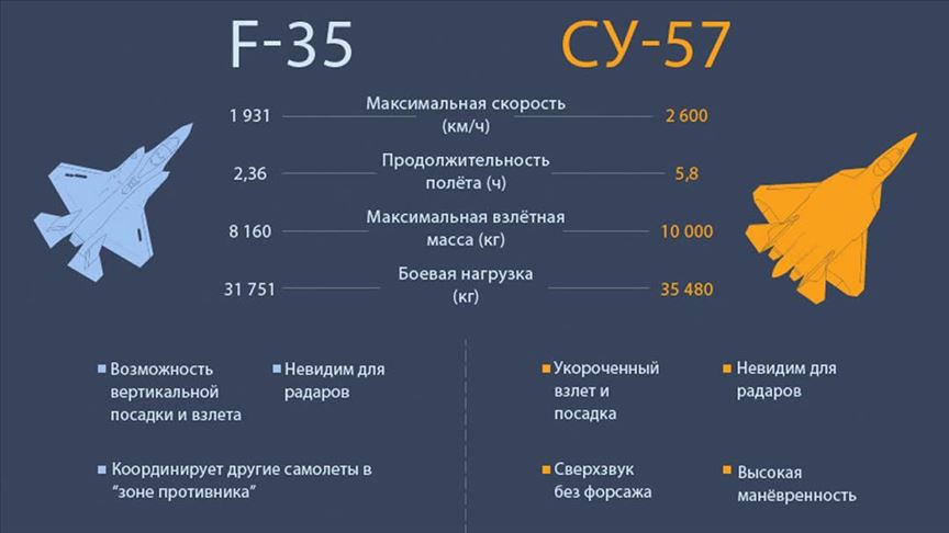 Государственное турецкое информагентство Anadolu опубликовало инфографику, в которой сравнило характеристики американского истребителя F-35 и российского Су-57, РИА Новости, 03.03.2020
