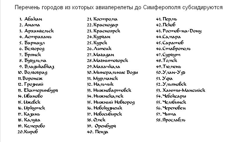 Перечень субсидируемых маршрутов в 2019 году сократился. Если в 2018 можно было улететь в Крым из 61-го города страны, в этом году их количество сократилось до 11. Добраться до Симферополя по сниженным ценам смогут жители лишь некоторых городов и регионов.