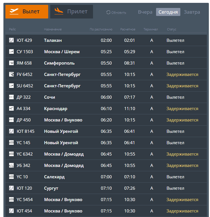 На онлайн-табло можно ознакомиться с прилетевшими и вылетающими рейсами аэропорта. Онлайн-табло — https://tjm.aero/passengers/information/timetable/. Более подробно с расписанием рейсов можно ознакомиться по ссылке. Для открытия списка рейсов нужно выбрать город, авиакомпанию или ввести нужную дату.