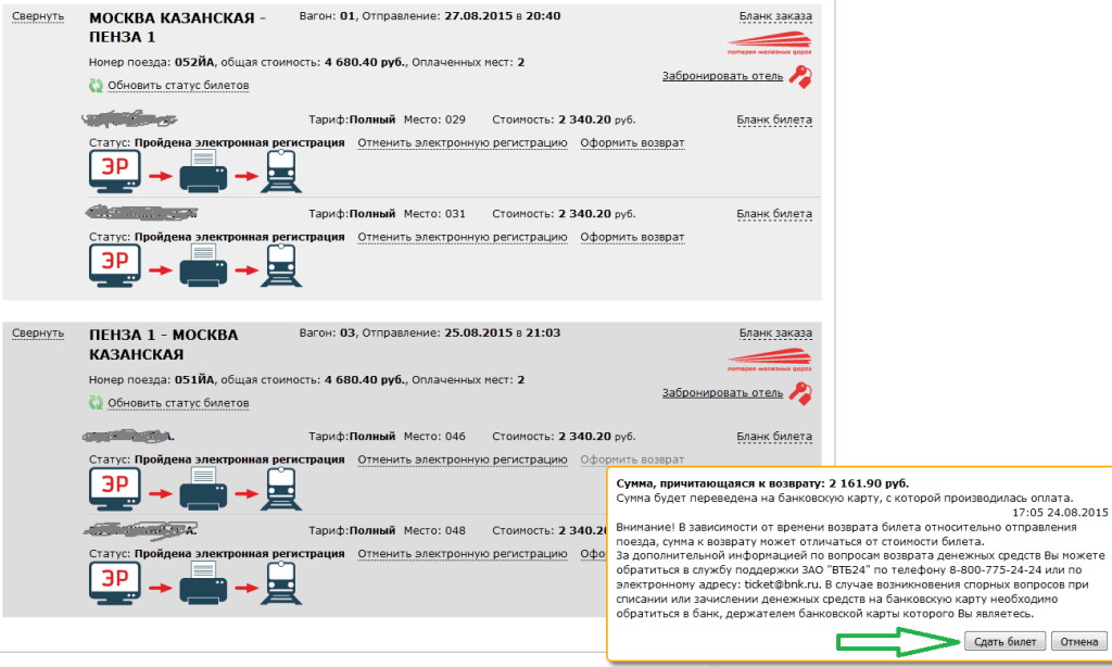 - Лицо, на которое оформлен билет и для которого нет свободных мест в поезде, на который оформлен билет, при сдаче билета в течение трех часов после отправления поезда имеет право на немедленный возврат стоимости проезда. .