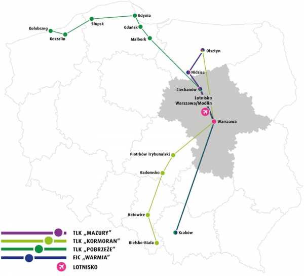 В каких случаях поездка на поезде может быть предпочтительнее автобусов ModlinBus? Например, когда прилетевших пассажиров так много, что все места в автобусе будут заняты и придется ждать следующий. И чтобы не терять время, услуги Koleje Mazowieckie будут очень кстати.