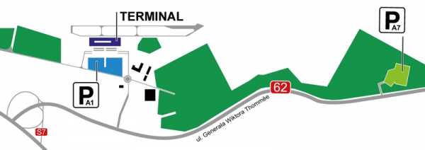 Для удобства пассажиров, путешествующих на собственных автомобилях, администрация аэропорта Модлин предоставляет две парковки, в сумме на 1300 машиномест. Ознакомиться с расположением автомобильных стоянок на территории аэропорта Варшавы Модлин Вы можете на схеме ниже: