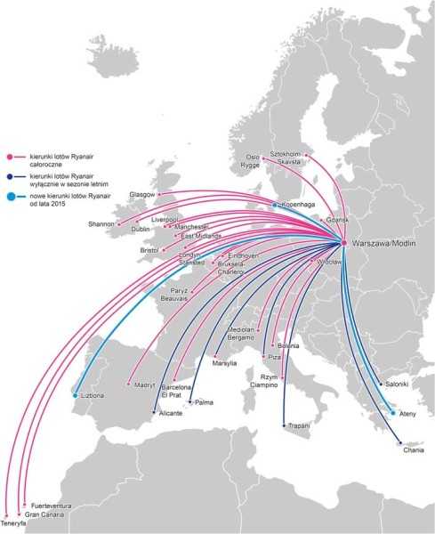 Направления полетов из Аэропорта Варшава Модлин (по состоянию на май 2015 г.): Вроцлав, Гданьск, Стокгольм, Осло, Копенгаген (с 2015 г.), Лондон, Ливерпуль, Манчестер, Глазго, Бристоль, Брюссель, Дублин, Париж, Лиссабон, Мадрид, Барселона, Аликанте, Пальма де Майорка, Тенерифе, Гранд Канария, Рим, Милан, Пиза, Болонья, Трапани, Салоники, Афины, Ханья и др.