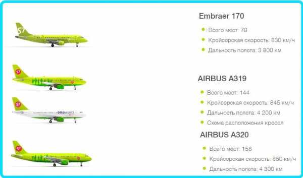 Airbus A319 авиакомпании S7 рассчитан на перевозку 144 пассажиров, дальность полета — 4 200 км. Boeing 737-800 S7 Airlines имеет 8 мест в бизнес-классе и 168 — в экономе, дальность полета — 5 765 км. Embraer E170 берет на борт 78 пассажиров, дальность полета составляет 3 800 км.