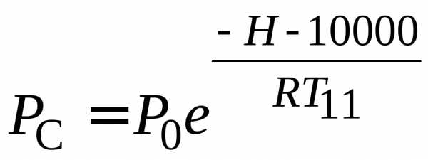 где P0— 760 мм рт. ст. — давление у поверхности земли; T0=273,16+15=288,16— температура у земли по Кельвину; r = 0,0065 град/м — температурный градиент высоты; R =29,27 м/град — газовая постоянная воздуха; T11— температура на высоте 11 км по Кельвину.