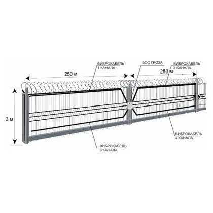 В основе решения — сверхчувствительный трибоэлектрический кабель, способный уловить любое механическое воздействие на заграждение, будь то перелаз, перекус, перепил или поднятие нижней части. ВСО ГРОЗА предусматривает использование до четырех независимых каналов длиной до 250 м, каждый из которых настраивается при помощи специального программного обеспечения. Настройка позволяет установить по каждому каналу соответствующие пороги по низким (для регистрации перелаза и подъёма нижней части заграждения) и высоким частотам (для регистрации перепила или перекуса).