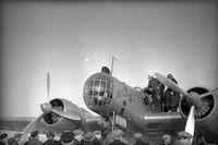 | Экипаж «Пути Сталина» (слева направо), штурман Беляков, пилот Чкалов и второй пилот Байдуков, прибывают на Пирсон Филд. |