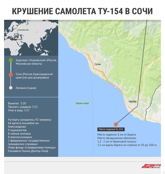 Военно-транспортный самолет Ту-154 Минобороны России потерпел крушение 25 декабря 2016 года в 5.27 мск после взлета с аэродрома Сочи, находящегося в городском районе Адлер. Самолет выполнял плановый перелет по маршруту Москва – Хмеймим (Латакия, Сирийская Арабская Республика).На его борту находились 84 пассажира и восемь членов экипажа, багаж пассажиров и 150 килограммов груза (продукты питания и медикаменты). По информации Минобороны России, грузов военного и двойного назначения, пиротехнических средств, указанным воздушным судном не перевозилось.В результате авиакатастрофы все 92 человека погибли. Среди пассажиров самолета были восемь военнослужащих, 64 сотрудника Академического ансамбля песни и пляски Российской армии имени Александрова, глава благотворительного фонда «Справедливая помощь» Елизавета Глинка, известная как Доктор Лиза, двое федеральных госслужащих, девять представителей российских телеканалов (Первого канала, телеканала «Звезда», НТВ).Елизавета Глинка везла медикаменты для университетского госпиталя в сирийской Латакии. Артисты Академического дважды Краснознаменного ансамбля песни и пляски Российской армии имени А.В. Александрова должны были выступить в Сирии перед российскими солдатами и офицерами. Среди погибших художественный руководитель коллектива народный артист России генерал-лейтенант Валерий Халилов, заместитель начальника ансамбля Андрей Сонников, главный хормейстер Константин Майоров, пять солистов. В общей сложности, ансамбль потерял почти половину творческого состава.26 декабря 2016 года был объявлен днем траура в Российской Федерации в связи с авиакатастрофой Ту-154 под Сочи. Самолет, следовавший с подмосковного аэродрома Чкаловский в Сирию, должен был совершить дозаправку в Моздоке. Однако из-за непогоды Ту-154 направили в Сочи. По прибытии в аэропорт Адлер, самолет был взят под охрану сотрудниками Пограничной службы ФСБ России и военнослужащими Минобороны России.Экипаж был готов к выполнению полета, уровень его квалификации соответствовал выполнению полетных задач. Командир экипажа майор Роман Волков имел налет около четырех тысяч часов, на данном типе самолета – полторы тысячи часов. В 5.25 по московскому времени Ту-154 взлетел с аэродрома Адлер, в 5.27 самолет пропал с радаров. Сотрудник береговой охраны пограничных войск ФСБ, который стал свидетелем крушения Ту-154, рассказал, что перед катастрофой самолет летел на небольшой скорости с «неестественно задранным вверх носом». Пограничник находился на катере в Черном море. По его словам, самолет, вместо того чтобы набирать высоту, стал быстро снижаться к поверхности моря, как будто собираясь сесть, и в следующее мгновение задел поверхность воды хвостом, который при ударе отвалился. Максимальная высота, на которую поднялся самолет, составила около 250 метров, а его скорость была в пределах 360-370 километров в час. К поиску потерпевшего крушение воздушного судна были привлечены все поисково-спасательные службы министерства обороны и других федеральных ведомств. Всего в поисковой операции принимали участие более 3,6 тысяч человек и свыше 500 единиц техники, в том числе 45 плавсредств, 15 самолетов, 16 вертолетов и беспилотные летательные аппараты. Это силы и средства МЧС России, Минобороны, Росавиации, Росморречфлота, Пограничного управления ФСБ 