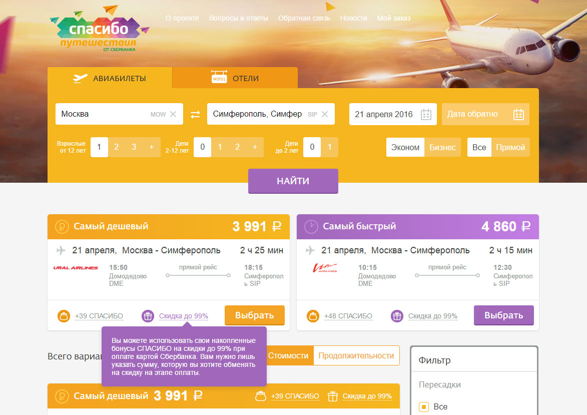 - поиск предложений. Вам нужно заполнить форму поиска, указав все параметры перелета – страна вылета, страна прилета, дата. Имеется функция расширенного поиска, позволяющая подобрать варианты, которые устроят вас по всем параметрам;